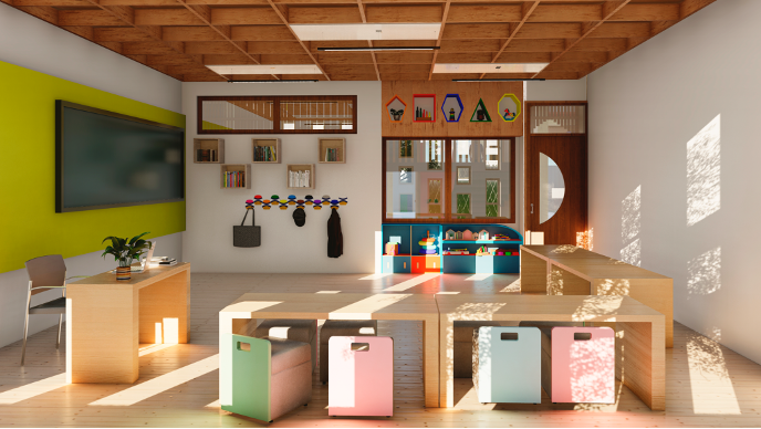 Incorpora elementos naturales dentro del espacio educativo, como madera, piedra, y fibras naturales en los acabados y el mobiliario. Estos materiales no solo son estéticamente agradables, sino que también pueden mejorar la calidad del aire interior.