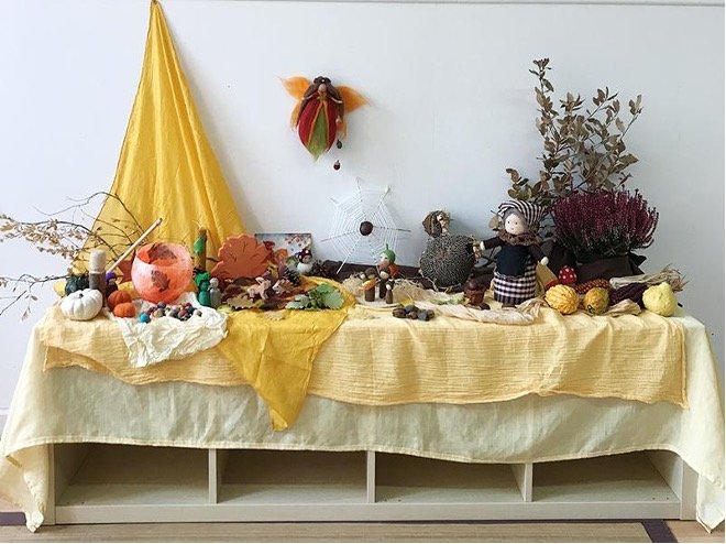 La mesa de estación se coloca siempre en el mismo lugar, creando un punto de referencia constante para los niños. Esto le da una sensación de estabilidad y permanencia, lo que es importante en la rutina diaria del aula. Los niños saben que este espacio está dedicado exclusivamente a representar la estación del año y no es un lugar para actividades lúdicas, lo que refuerza su función como un espacio de respeto y reverencia hacia la naturaleza.